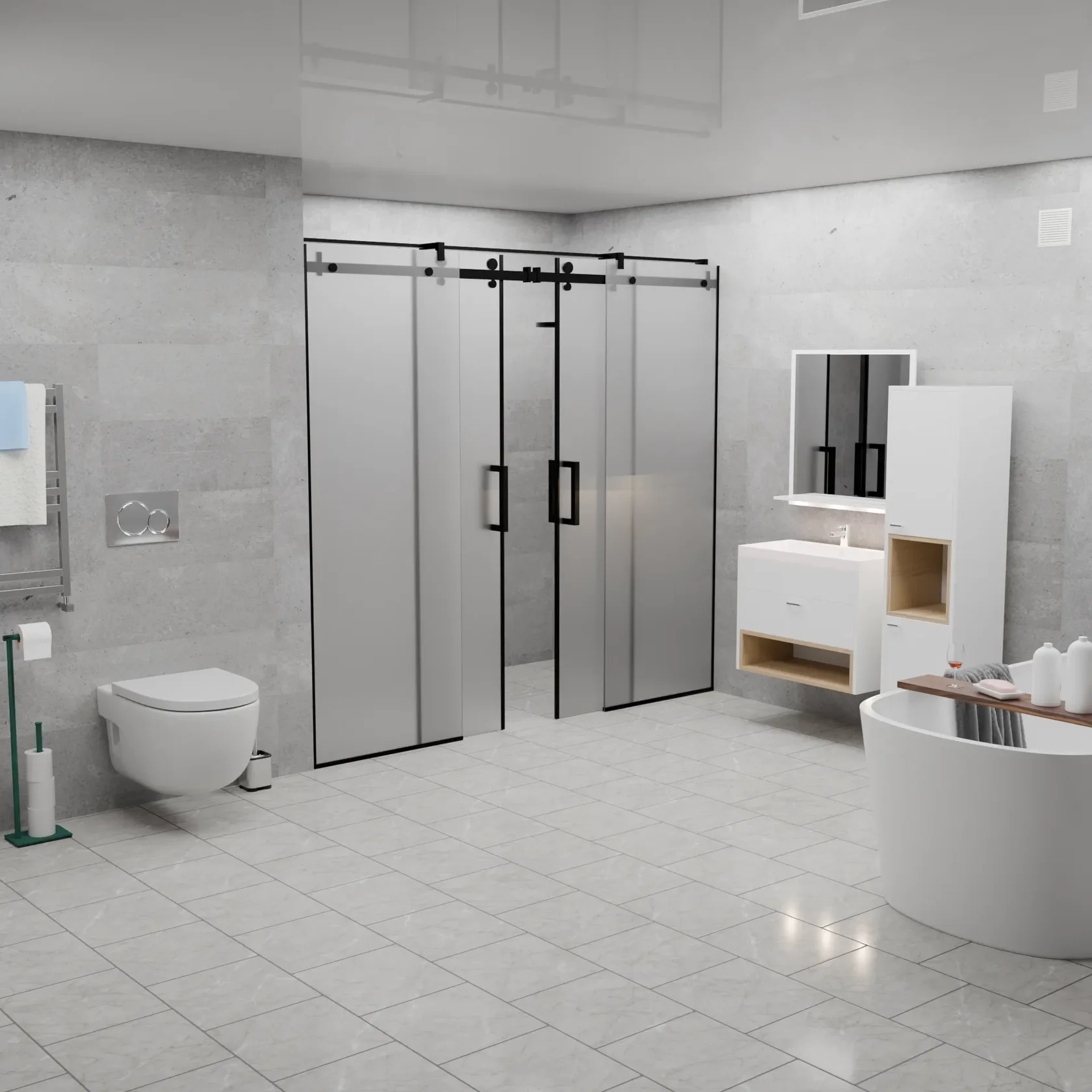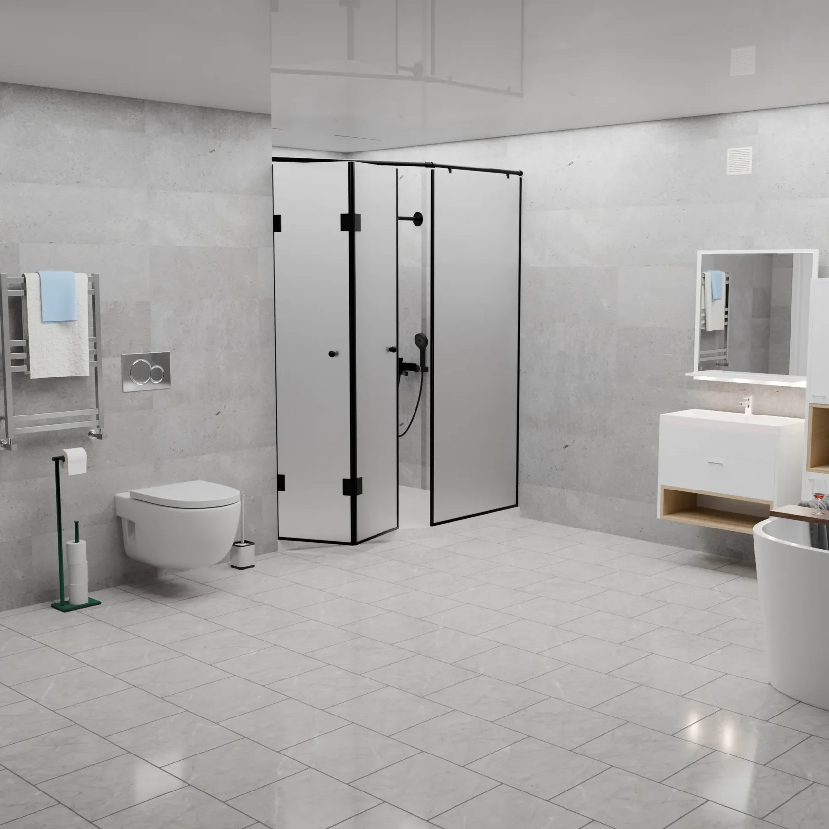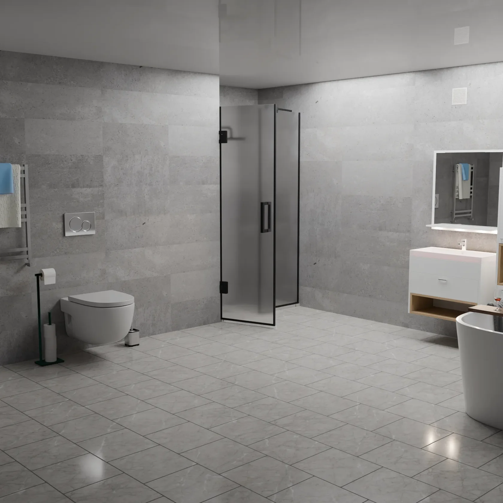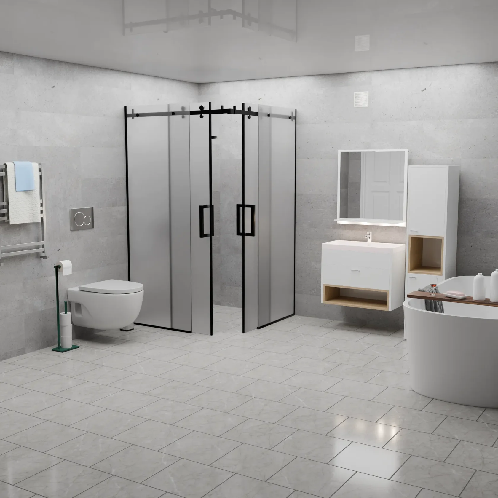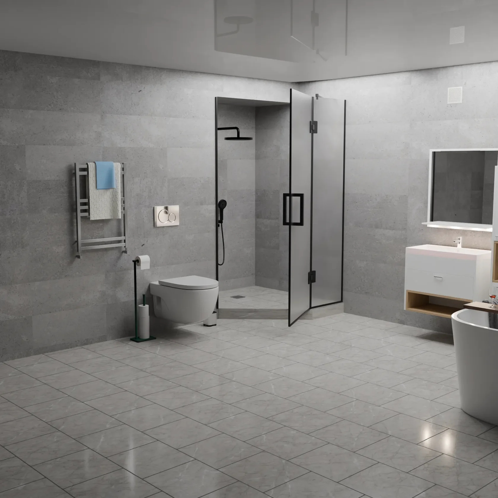 Вершина современного дизайна ванной комнаты, сочетающая в себе изысканность графитового оттенка и функциональность матового покрытия.
