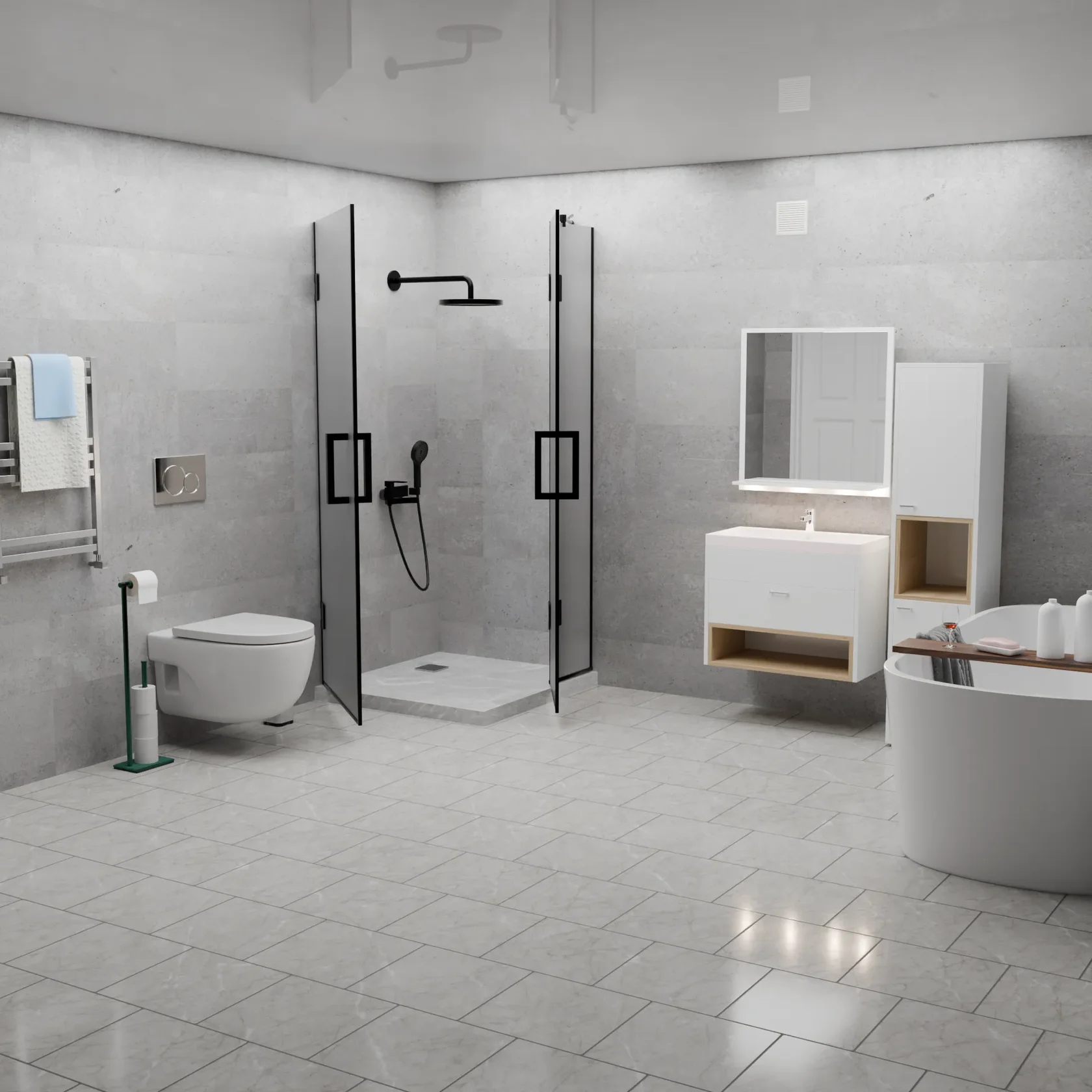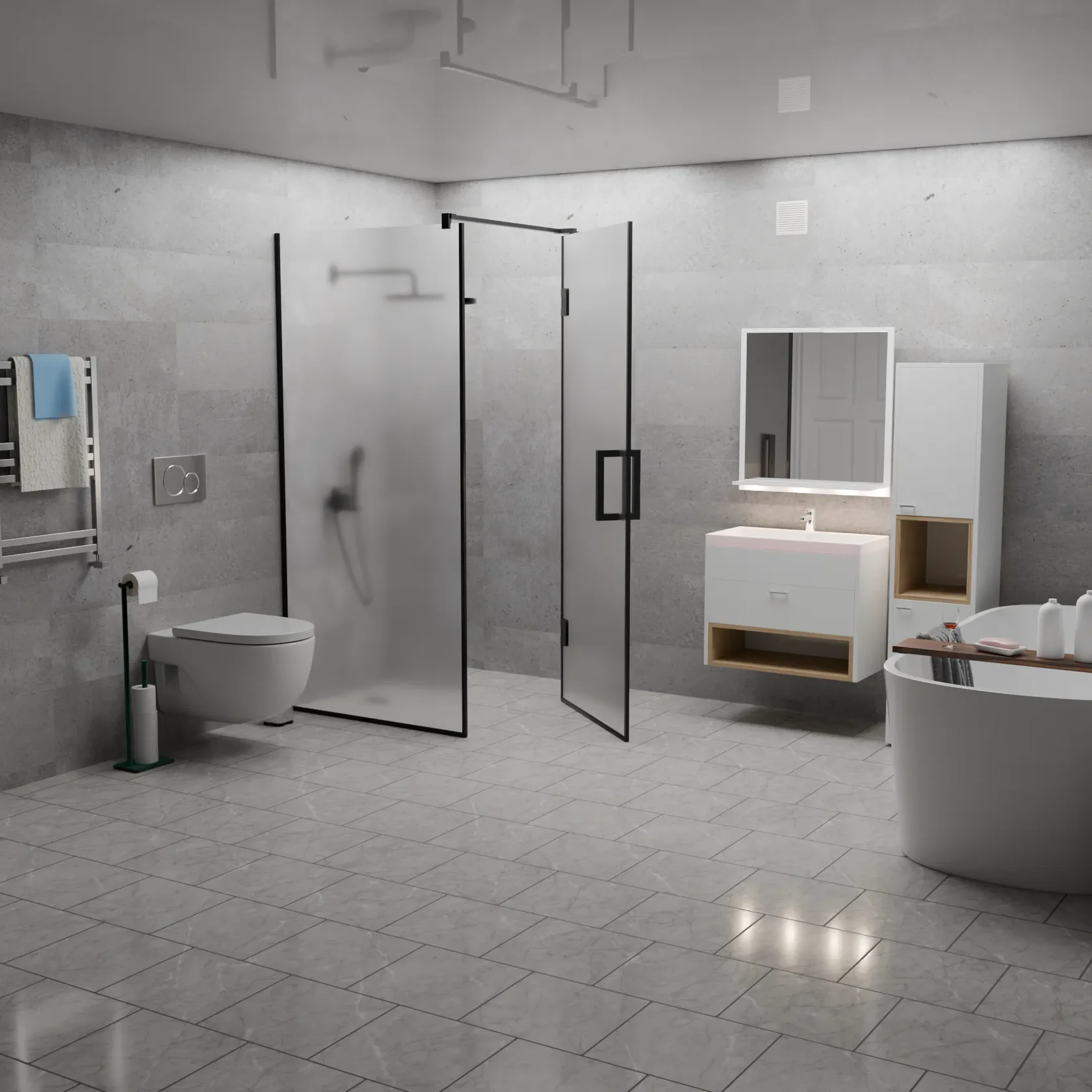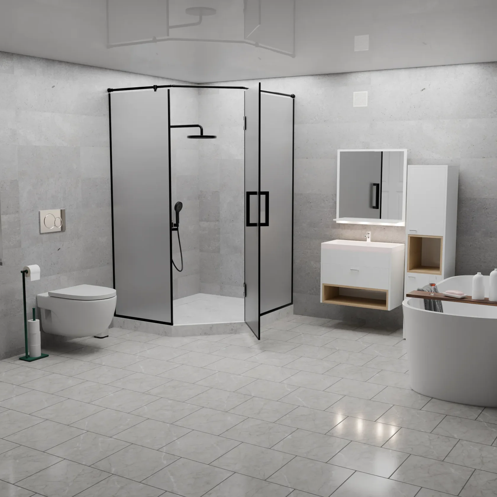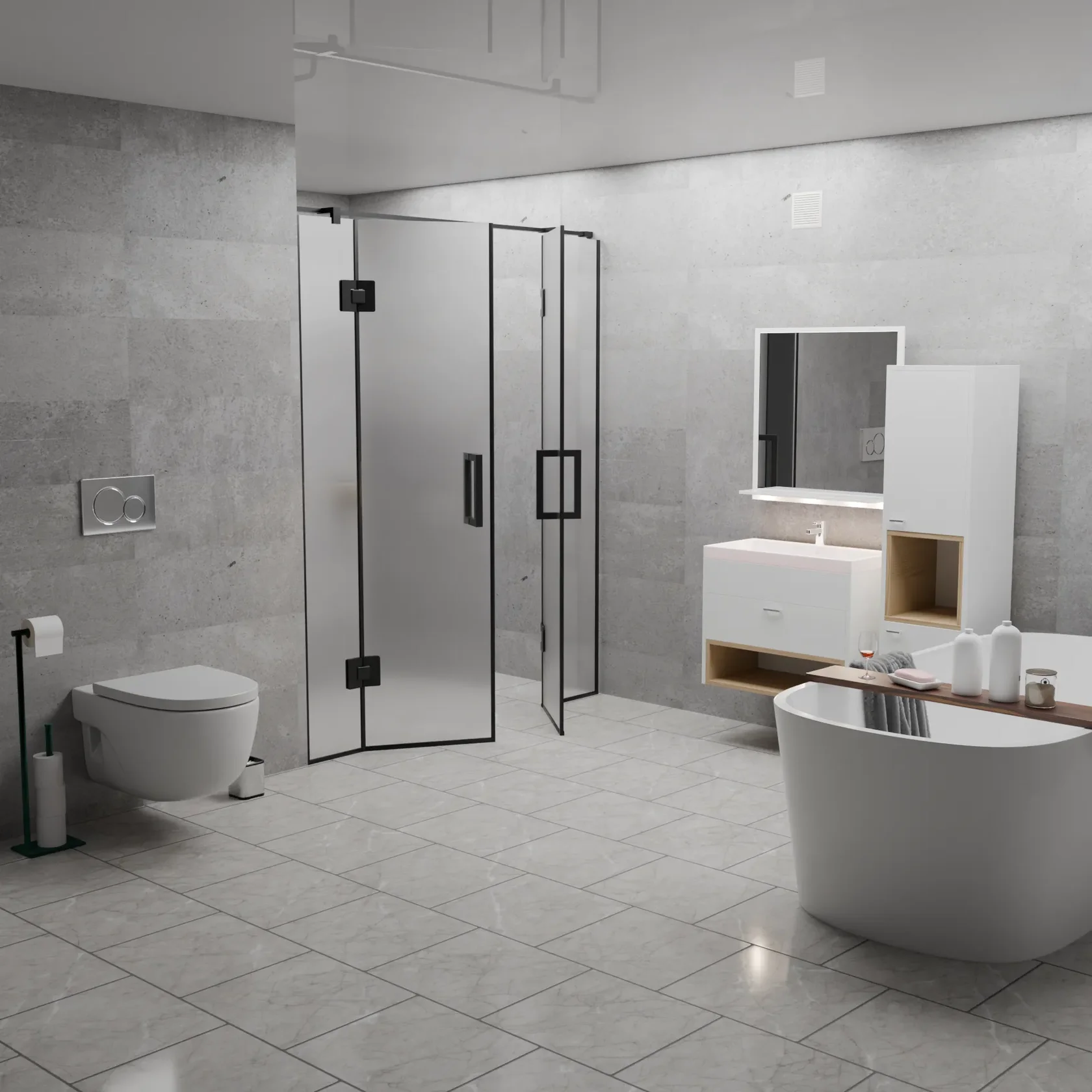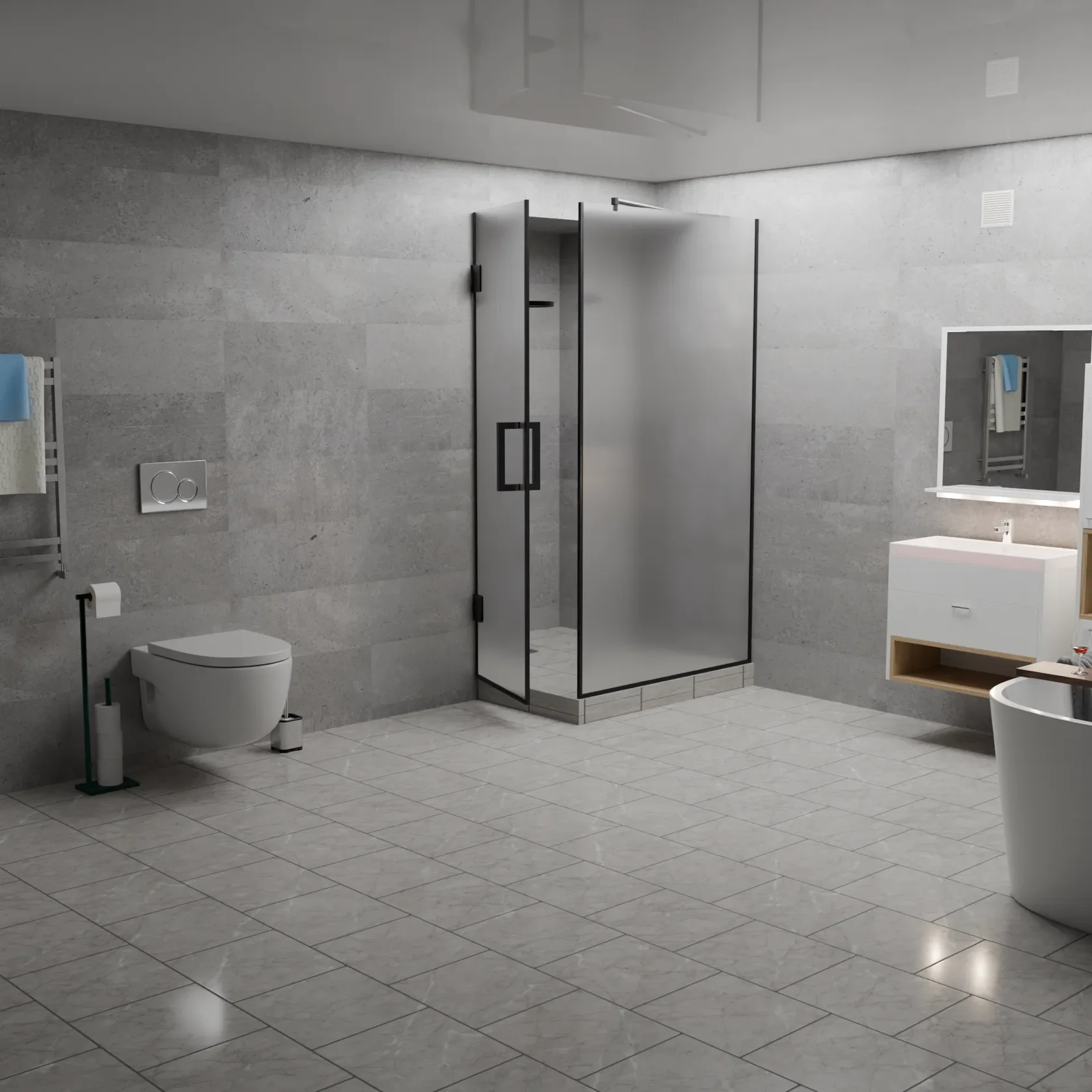 Вершина современного дизайна ванной комнаты, сочетающая в себе изысканность графитового оттенка и функциональность матового покрытия.