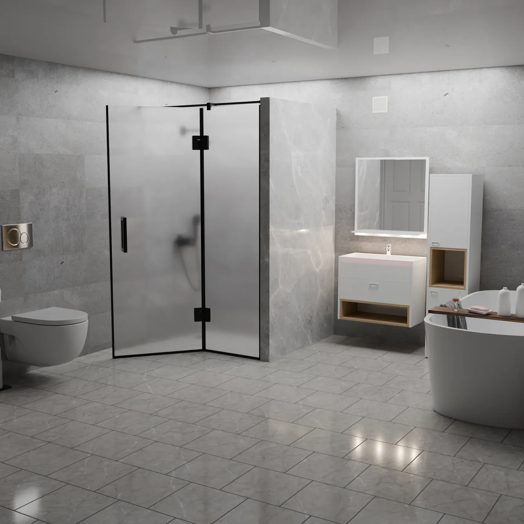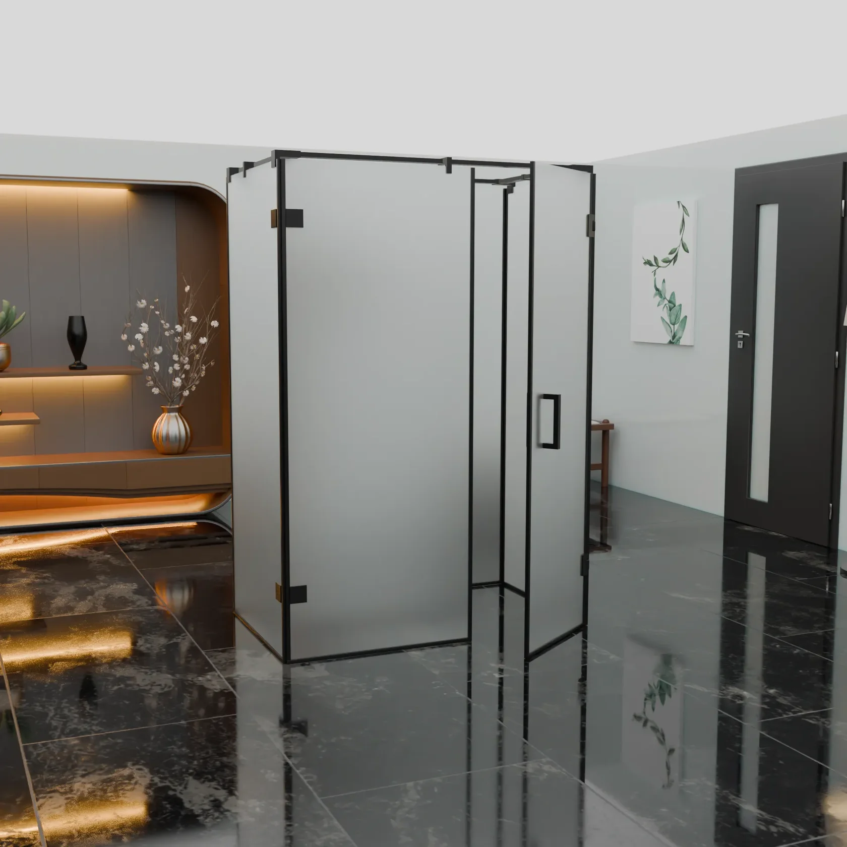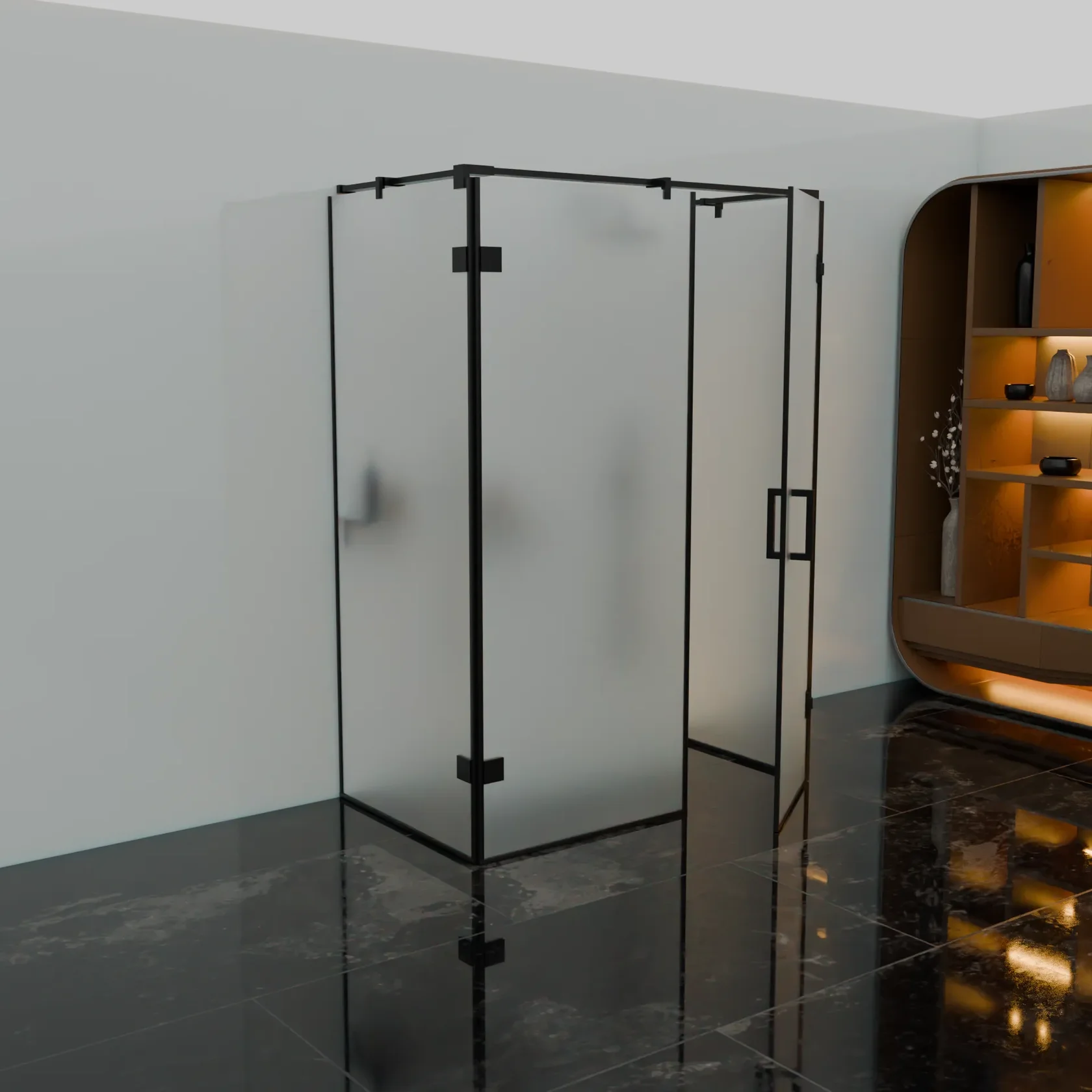 Матовая поверхность при этом обеспечивает необходимую приватность, рассеивая свет и скрывая детали внутри душевой кабины.