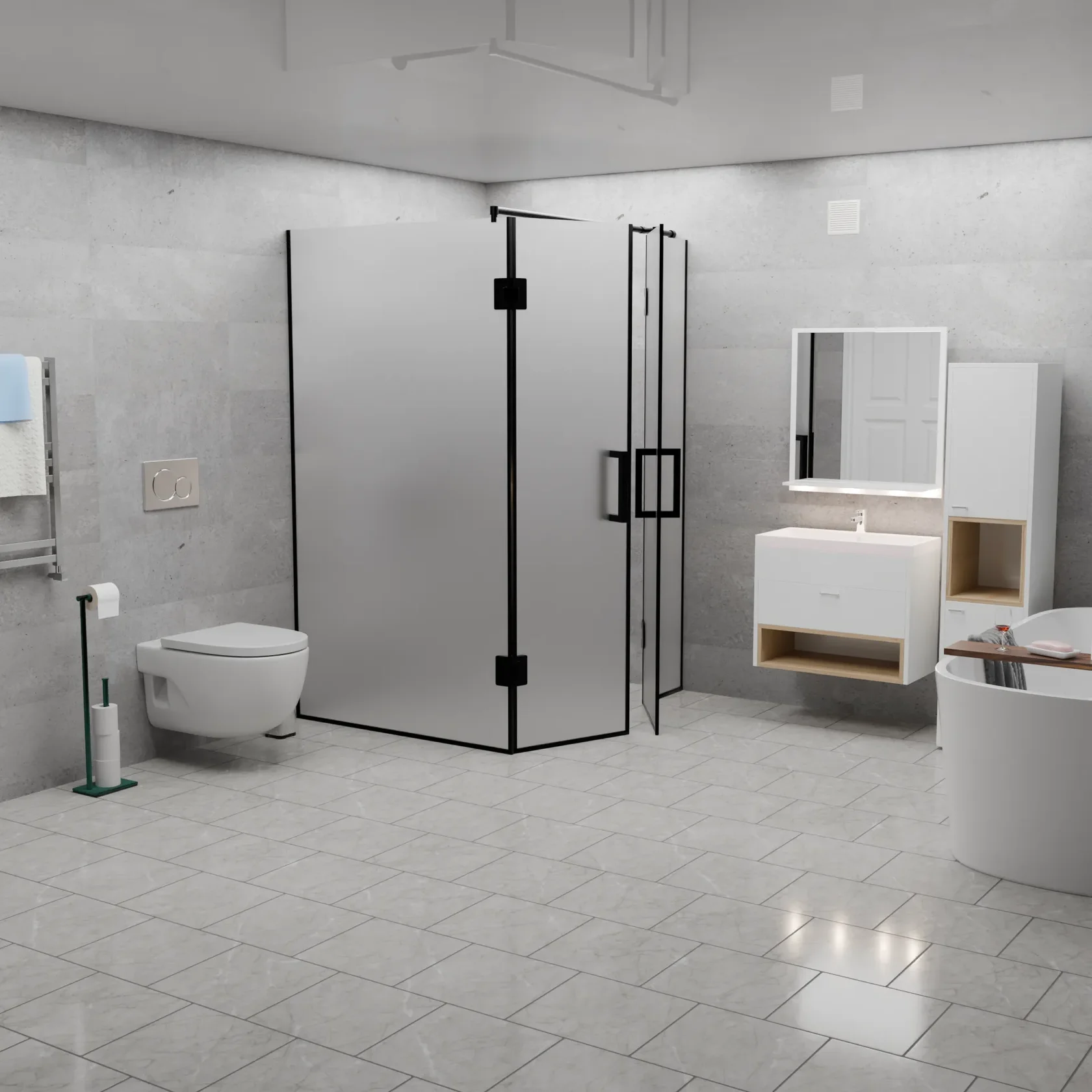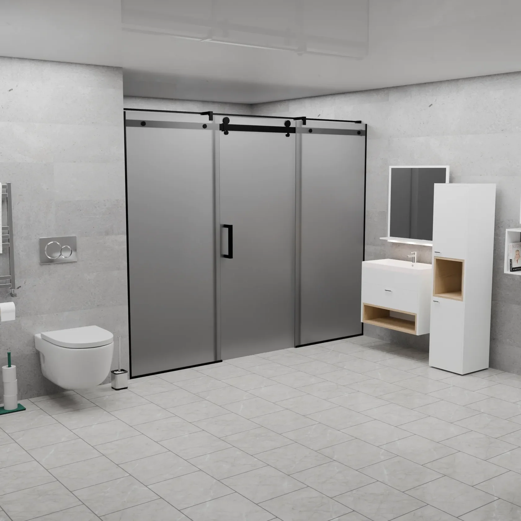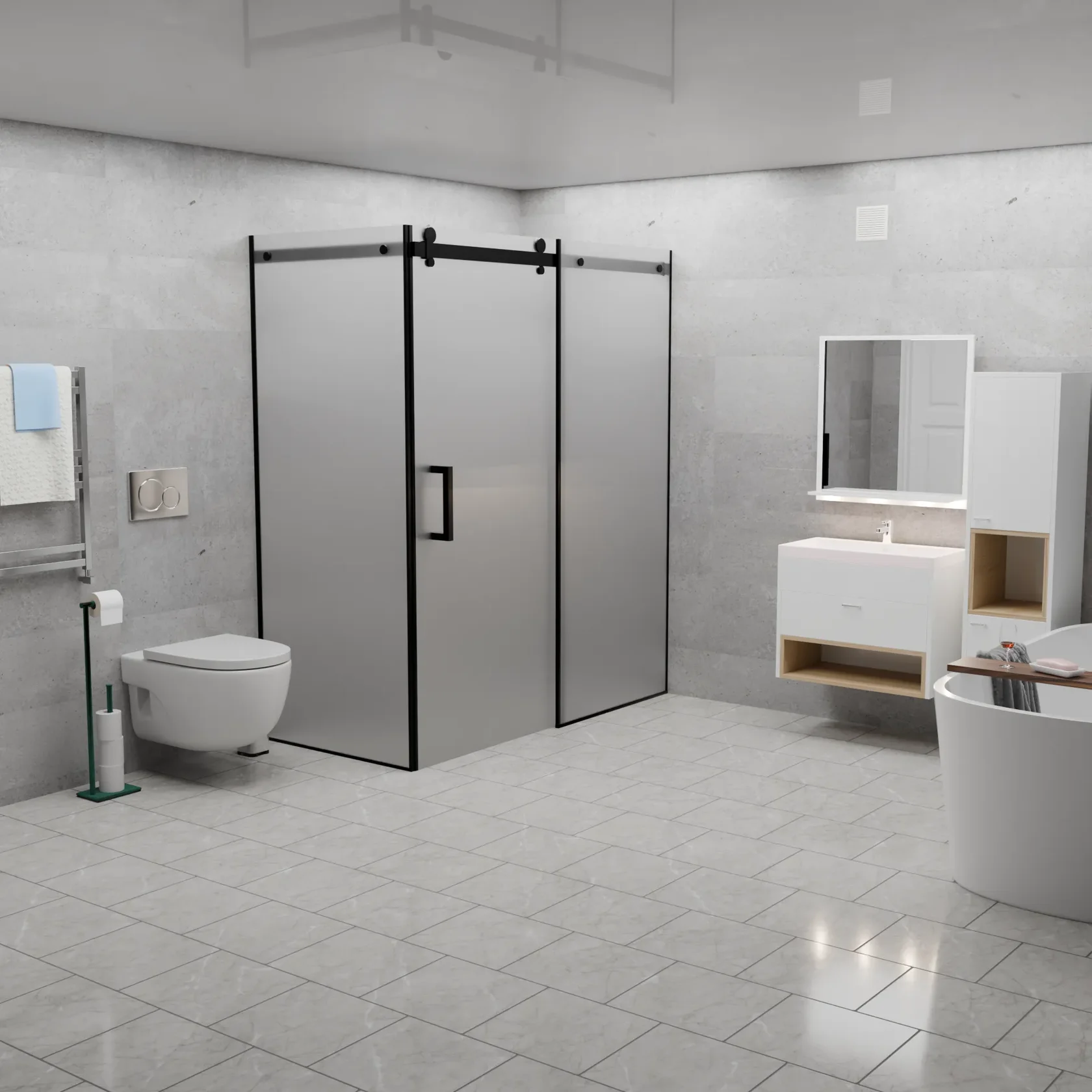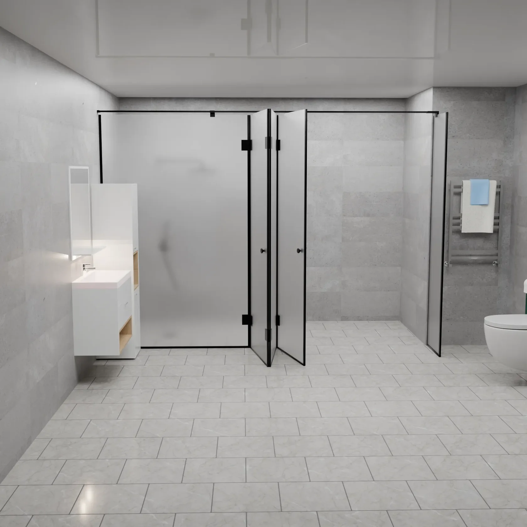 Матовая поверхность при этом обеспечивает необходимую приватность, рассеивая свет и скрывая детали внутри душевой кабины.