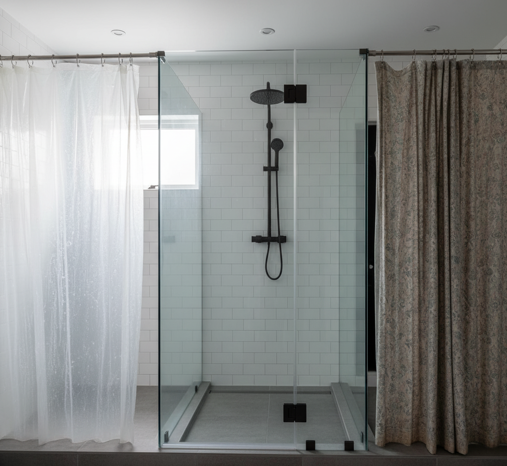 - Внешний вид: тканевые шторы после нескольких недель теряют привлекательность, собирают кальциевый налёт, скручиваются. Пластиковые — желтеют и мутнеют. Стеклянная перегородка (особенно без рамки) визуально “исчезает” в пространстве — ощущение чистоты и порядка.